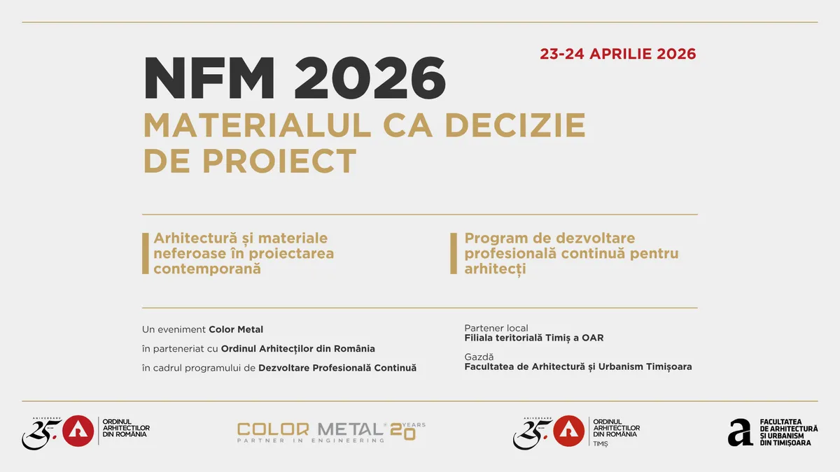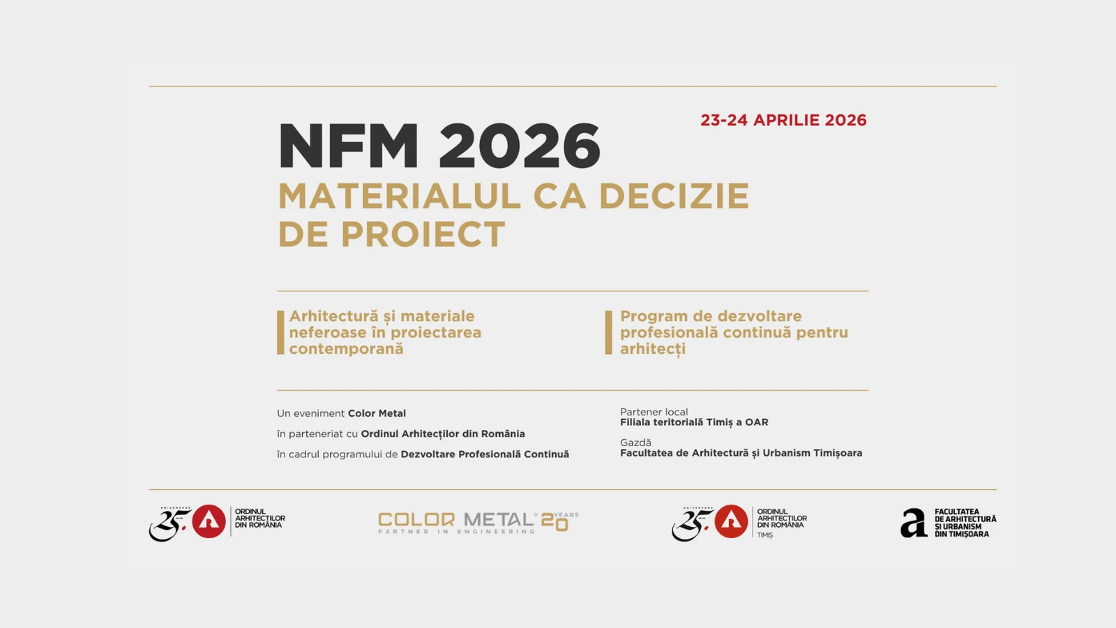 Conferința se va desfășura la Timișoara între 23 și 24 aprilie, în sala ARCHA a Facultății de Arhitectură și Urbanism din cadrul Universității de Politehnică și este dedicată arhitecturii contemporane, materialelor neferoase și dialogului dintre design, tehnologie și sustenabilitate.