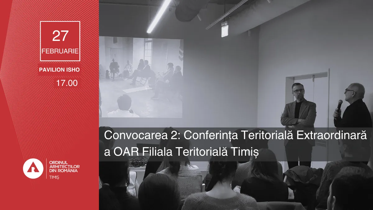 Vă anunțăm că, din cauza numărului insuficient de confirmări online primite din partea membrilor OAR Timiș, nu a fost obținut cvorumul necesar pentru ca prima convocare a Conferinței Teritoriale Extraordinare să fie legal constituită. În consecință, vă convocăm la a doua întrunire, care va avea loc pe 27 februarie 2026, la ora 17:00, la Pavilionul ISHO, Bld. Take Ionescu nr. 50-52, Timișoara.