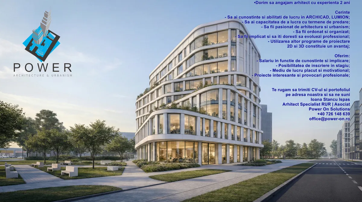 Dacă ești interesat, te rugăm să trimiți CV-ul și portofoliul la adresa office@power-on.ro și să îi contactezi telefonic la 📞 +40 726 148 639 - Ioana Stancu Ispas, Arhitect Specialist RUR.